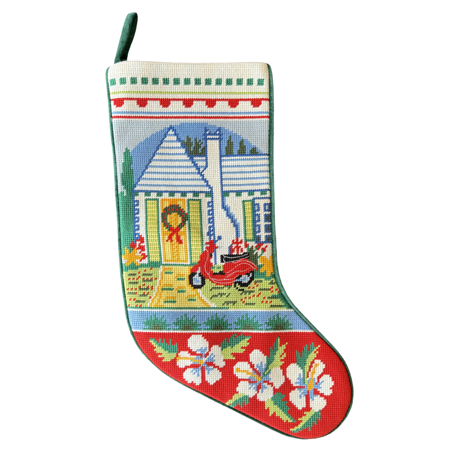 Bring cozy charm to your mantel with this beautiful needlepoint stocking featuring a festive Bermuda cottage scene complete with a cheerful wreath and classic red scooter. A timeless keepsake that captures the warmth and whimsy of a Bermuda Christmas.