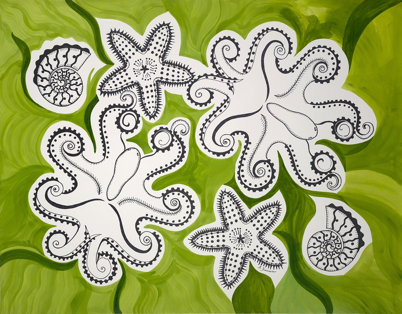 Sea Creatures Hand-Painted Print in Green